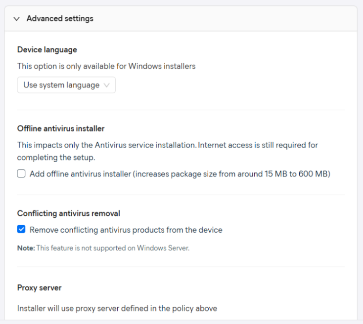 - Decide whether to add the offline Antivirus installer (Windows packages only)