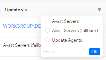 In cases where Update Agent is normally used, but the device is outside the network or Update Agent is inaccessible at the time, the column will display Avast Servers (fallback). If the device is in a different network/not using Update Agent, the column will display Avast Servers instead.